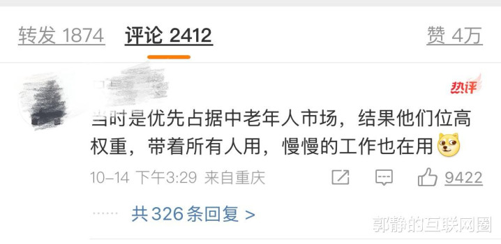 其中,最热的一条微博内容,1000多人转发,2422条评论,4万人点赞(数据截至稿前)。该微博底下最热的一条微博也很让人扎心,“当时是优先占据中老年人市场,结果他们位高权重,带着所有人用,慢慢的工作也在用”,该评论的点赞量达9422次(数据截至稿前)。如果继续往下翻热门评论,也能看到更多年轻人对用微信的“老年人”的嫌弃。